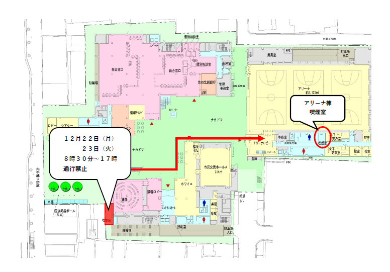 作業中は西棟喫煙室が使用できません。アリーナ棟の喫煙室をご利用ください。