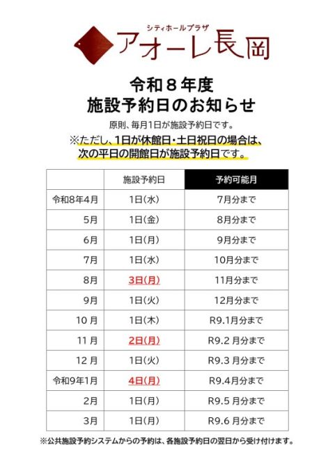 ※公共施設予約システムからの予約は、各施設予約開始日の翌日から受け付けます。