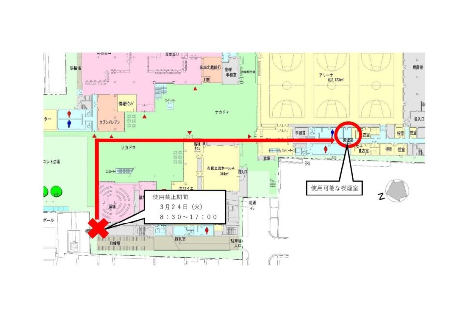 工事期間中は西棟喫煙室をご利用いただけませんので、アリーナ棟喫煙室をご利用ください。