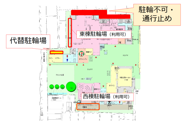 期間中は、通路の迂回をお願いするとともに、駐輪場をご利用の際は代替駐輪場等をご利用くださいますようお願いいたします。